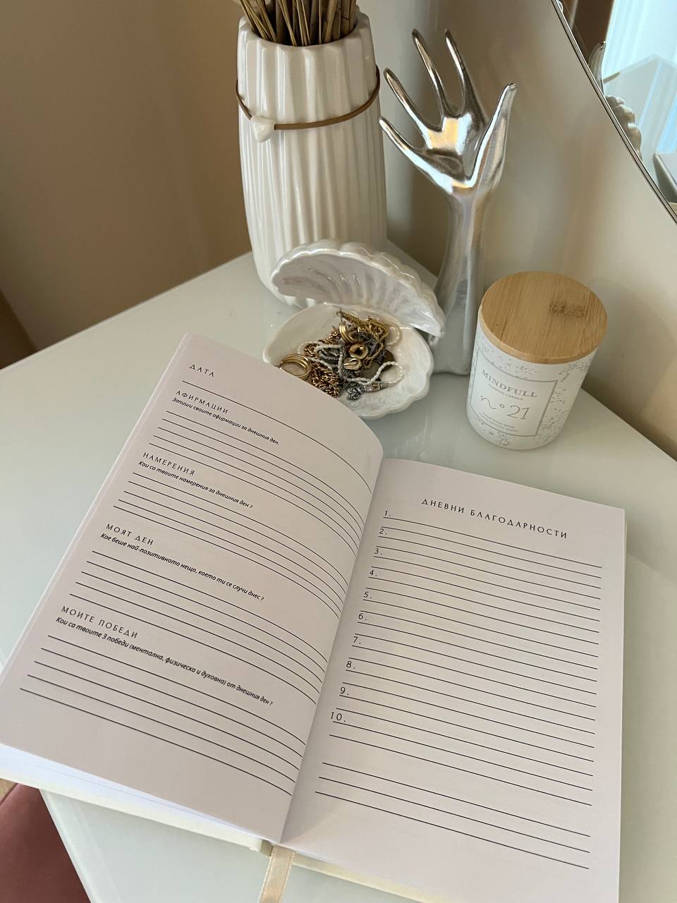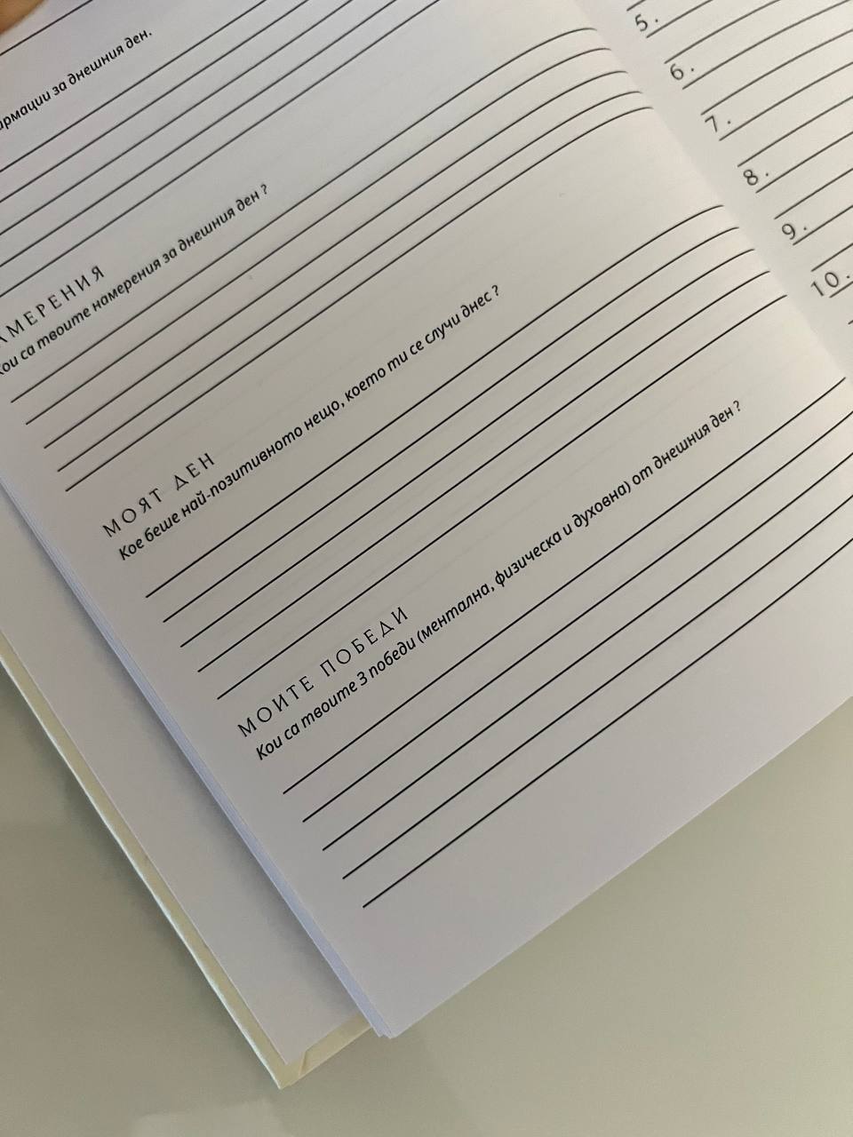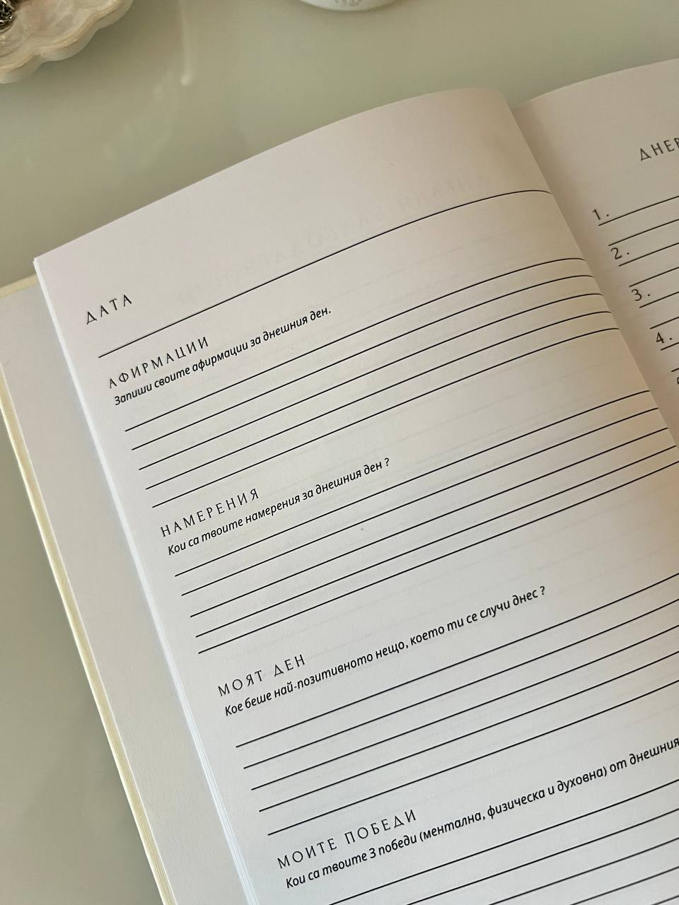 - Секция за формулиране на дневните ви намерения, така че да фокусирате енергията си върху най-важното.